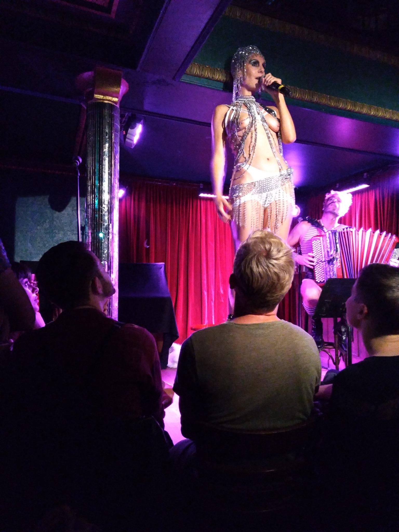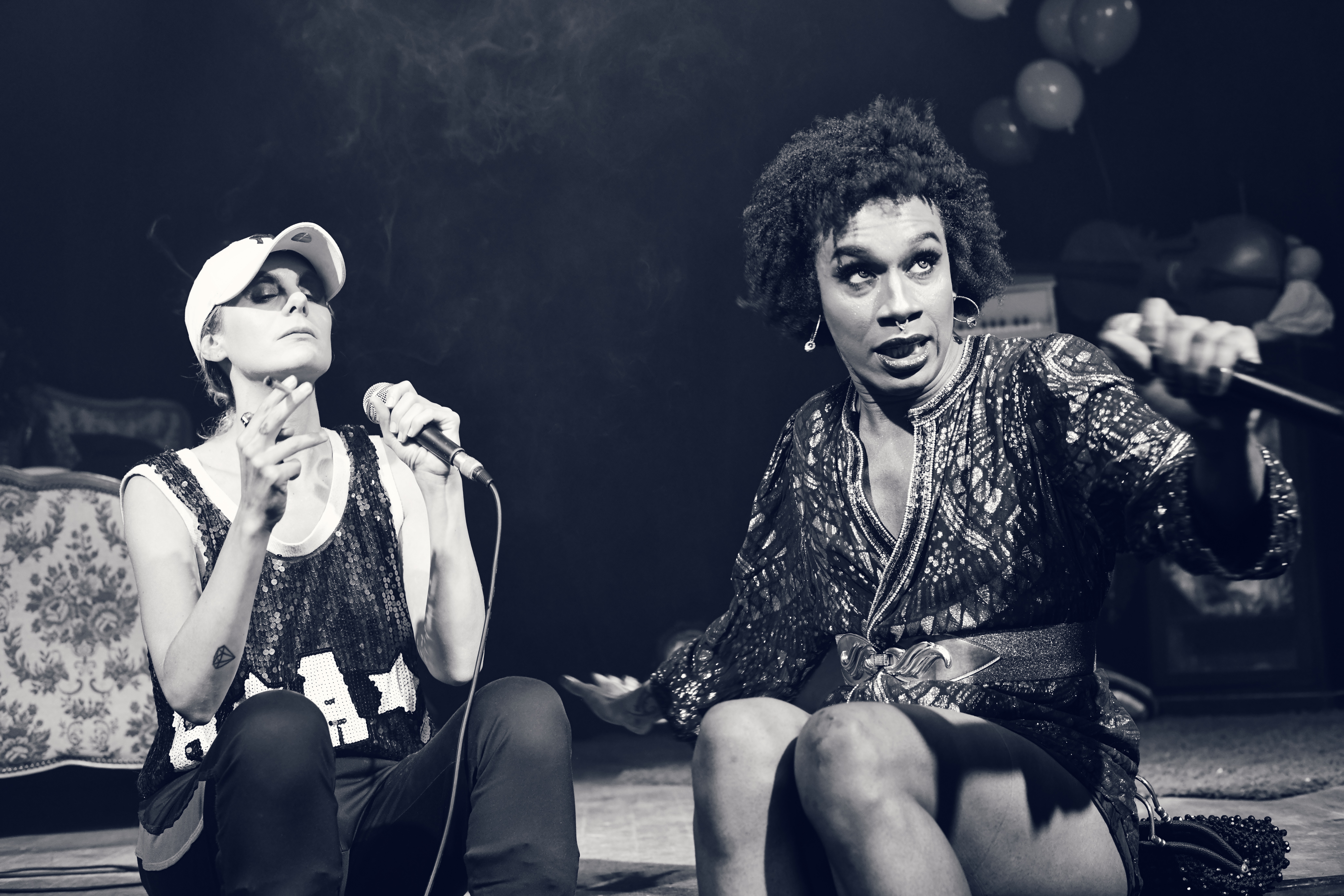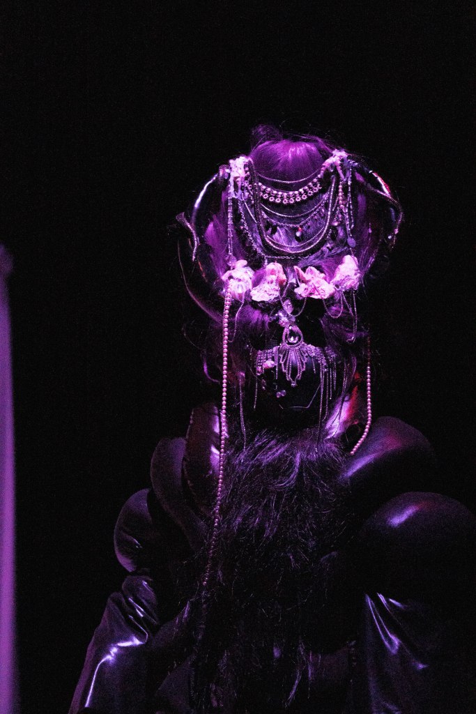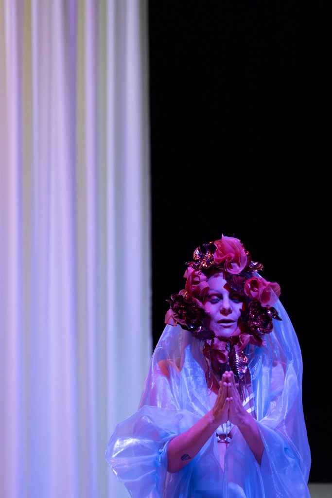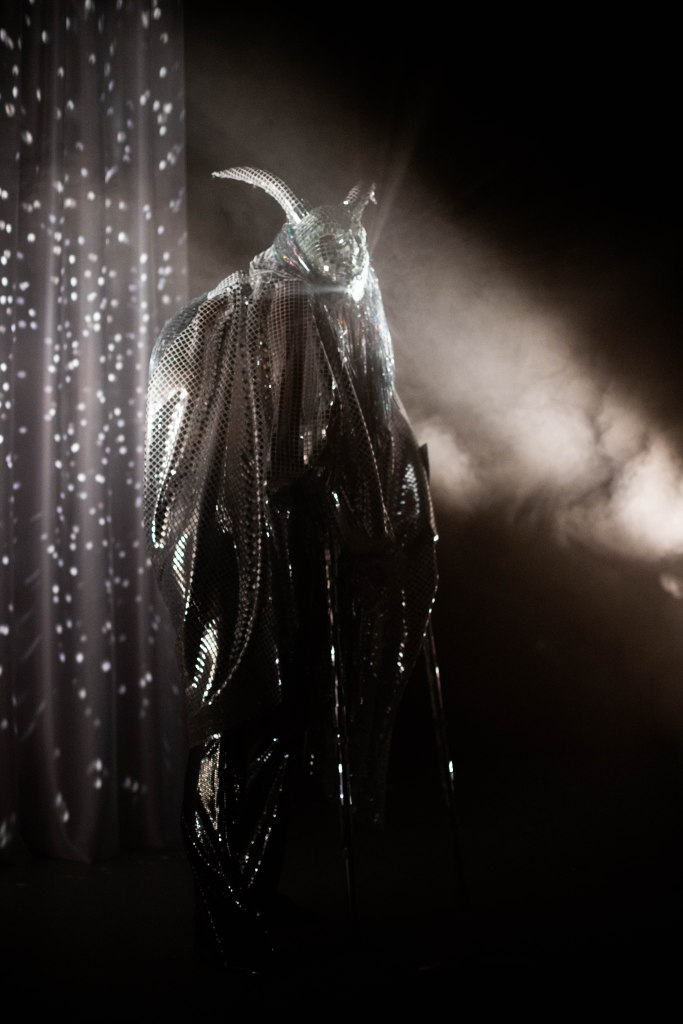 On la retrouve donc au centre d’une boîte blanche minimaliste façonnée de lumières, où chaque soir, les spectateurs participent à une “prophétie divinatoire“ façonnée selon leurs choix ou interventions, une once de hasard et des dispositifs algorithmiques. Chacun des tirages, sur les 22 disponibles, laissera surgir une atmosphère aussi irréelle que chimérique. Dans une esthétique mêlant arts forains, freak show, new-age, cabaret, stand-up et cyberfuturisme, l’artiste s’appuie sur son passé de performeuse transformiste pour incarner les multiples avatars, semblables aux cartes d’un jeu de tarot animé.